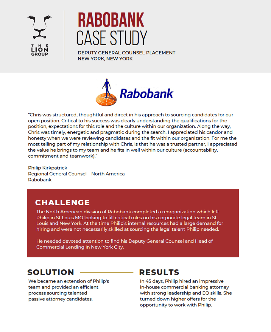 Select the following for more information: Our Search Process, Our Testimonials and Case Studies, and Our In-House Legal Career Focused Newsletter.